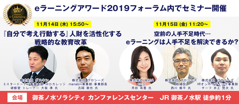 eラーニングアワード2019フォーラムに出展し、「人財を活性化する戦略的な教育改革」「人手不足時代のeラーニング」の2つのセミナーを行います。
