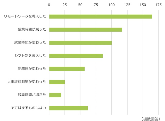新型コロナウイルスの影響で「リモートワークの導入」「残業時間の減少」「就業時間の変化」といった働き方の変化が起こっていることがうかがえる結果となりました。
