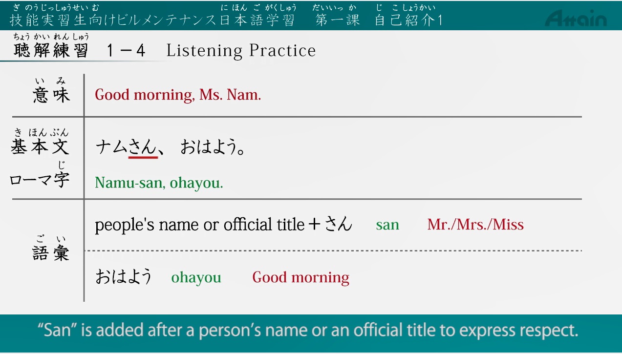 日本語能力試験学習サイト「オンライン日本語」運営、eラーニング制作のアテイン株式会社(本社:東京都千代田区、電話:03-3255-4721、代表本多成人、資本金1億1470万円)は、ビルクリーニング外国人材受入機関の日本語教育支援のため、「技能実習生向けビルクリーニング日本語学習」eラーニングを4月から提供します。(価格調整中)