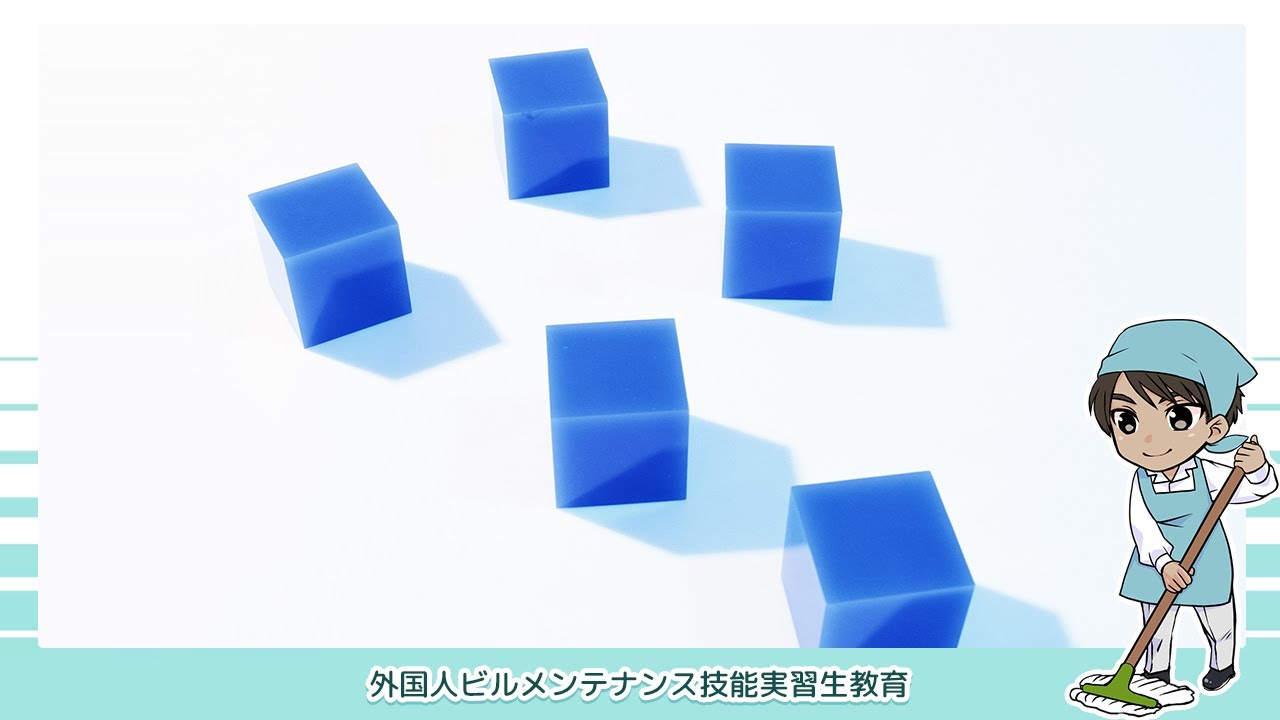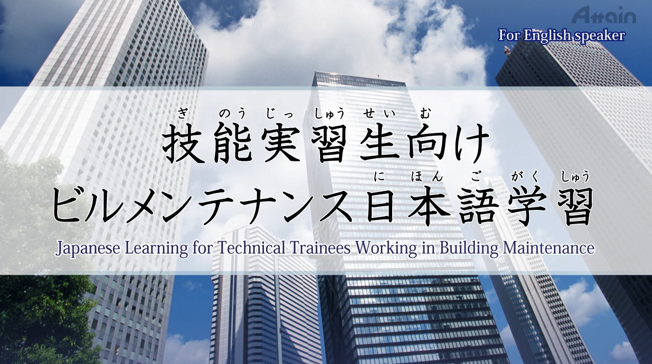 「技能実習生向けビルメンテナンス日本語学習(別名:技能実習生向けビルクリーニング日本語学習)」はビルクリーニング外国人技能実習生を対象に開発した日本語を学習する動画教材です。学習者の一般的学習能力を配慮して、学びやすく、習得を確実にする「ゆるやかな教材」となっています。この教材ではビルクリーニング業界でよく使用する語彙・文法・主要表現など必要な基本的知識を映像で解説します。その内容を定着させるための練習も付きます。また、実際の会話の中に、ビルクリーニングの語彙と文法が応用されているので、ビルクリーニングの仕事に役に立つとともに、日本語でのコミュニケーション能力を向上させます。漢字に馴染みが無い国の方でも勉強ができるように、すべての漢字の上に、ひらがなのルビが付いています。初級日本語学習者に向け、ナレーションにすべて英語字幕を表示しています。例文と練習の部分はローマ字がフォローアップしています。外国人学習者の気軽に勉強できる教材となります。さらに、各課に学習テキストがPDFで付属し、印刷して予習や復習にご利用できます。