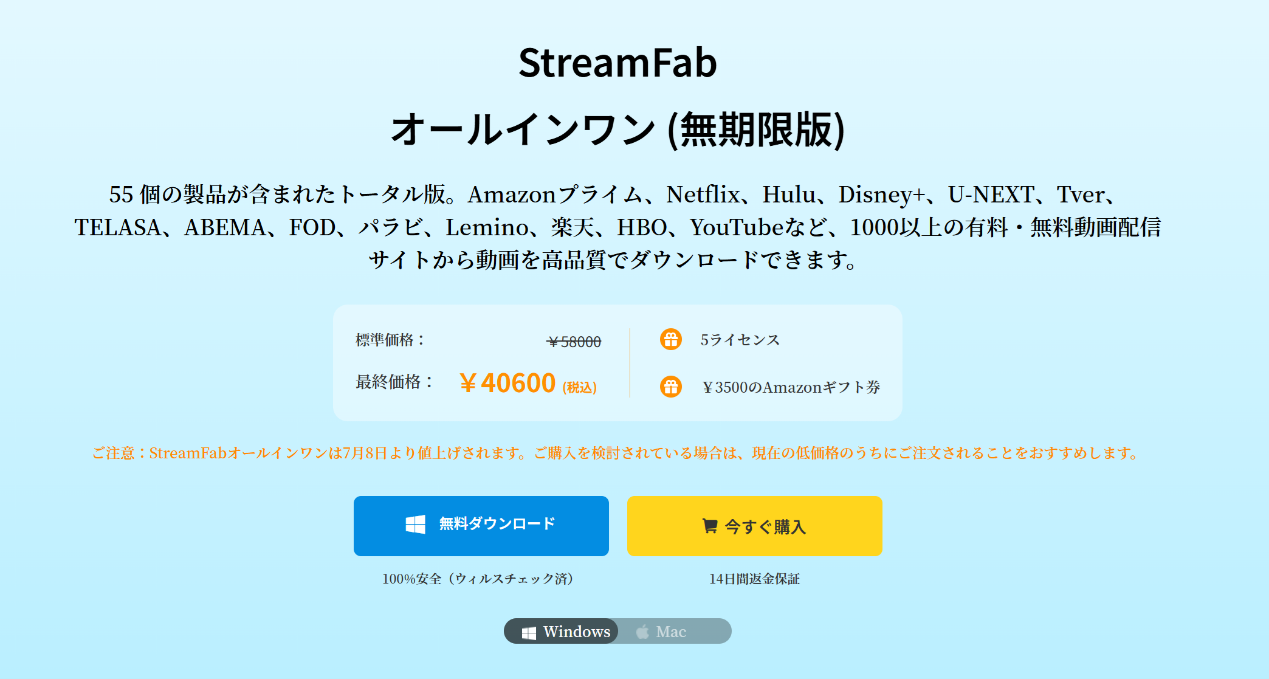 価格改定が間近に迫り、StreamFab オールインワンの販売価格は現在の価格から上昇する予定です。その同時、