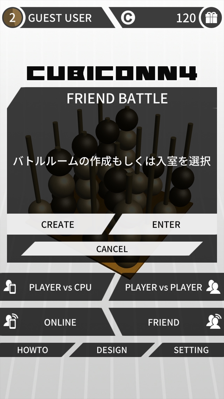 ホストとなるユーザーがCREATEボタンよりROOM IDを発行し、そのRROOM IDを他のユーザーがENTERメニューより入力することによりゲームを開始できる。