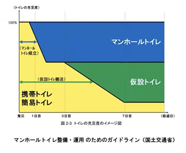 国土交通省の資料では、仮設トイレが発災から各地の避難所へ届くまで早くても3日以上、ほとんどの場合は4日以上かかるケースが多いと言われています。そのため、発災直後数日は避難所の個室トイレブースや簡易的なブース内での携帯トイレや簡易トイレを利用を想定し備蓄が推奨されています。