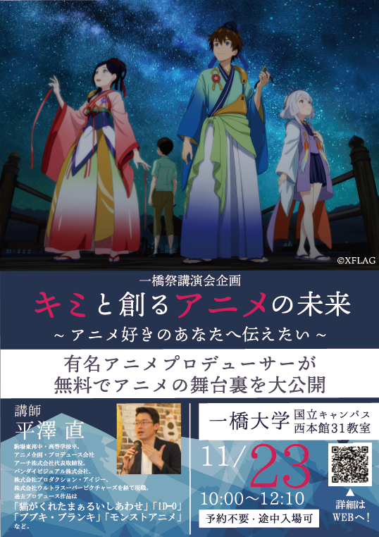 11月23日、一橋大学の全学祭である一橋祭において、有名アニメプロデューサー・平澤直がアニメ制作の裏側や現在のアニメ業界事情などを語るアニメ好きにはたまらない講演会を行います。