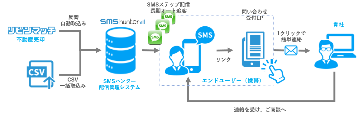 SMSハンターは、携帯電話やスマートフォンのSMS(ショートメッセージ)を用いて、見込客リストに対し、長期自動追客するための不動産業界に特化したSaaS型システムです。追客を実施したい任意のユーザーに対して90%以上という高い開封率が期待できるSMSのステップメールが送信されるため、継続的にコンタクトを取り続けることが可能になります。