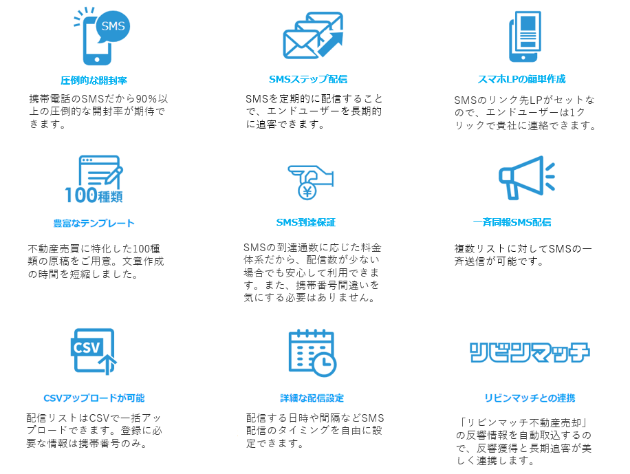 本サービスは、PCメールと比較して開封率の高い携帯電話やスマートフォンのSMS(ショートメッセージサービス)を利用して複数回にわたりSMS配信するステップ配信技術を応用した不動産業界に特化した追客用SaaSです。