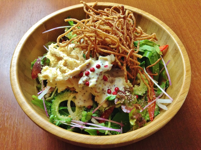 お蕎麦の上には10種類以上の新鮮野菜がたっぷりと添えられパリパリの揚げ蕎麦とともに自家製ドレッシングをかけていただくメニューです。具やドレッシングのカスタマイズが可能。