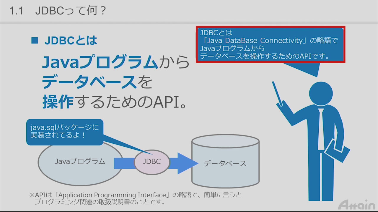 コンピュータートレーニング教材制作、eラーニング向けコンテンツ制作のアテイン株式会社(本社:東京都千代田区、電話:03-3255-4721、代表:本多成人、資本金:1億1470万円)は、月額2,800円(税込)で様々な動画講座が視聴し放題のクラウドeラーニングサービス「動学.tv(http://dougaku.tv/)」に、プログラミング言語JavaでのDBアクセスが学べる「誰でもわかる Java DBアクセス基礎」講座を、8月3日に公開します。