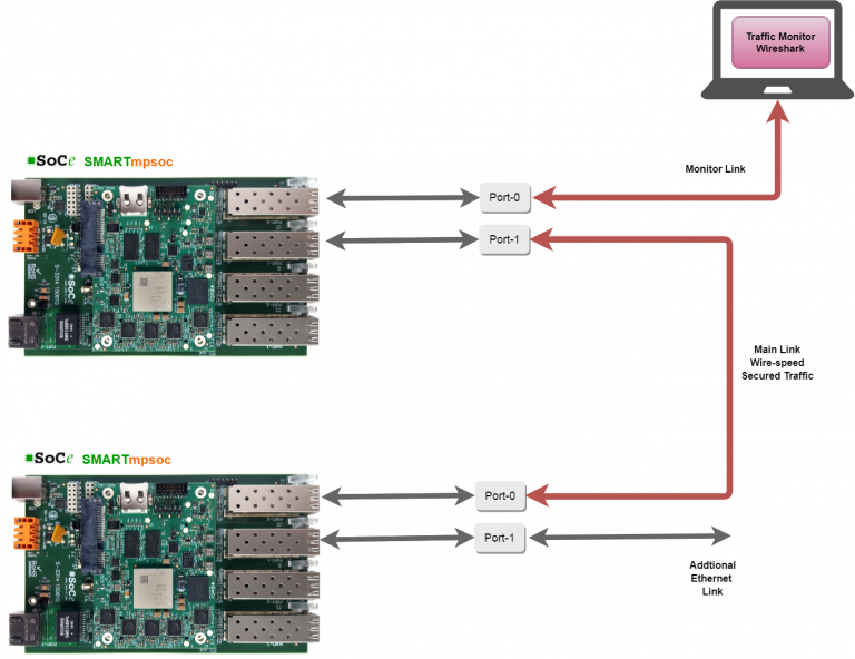 キットは2つのSMART mpsocブリックで構成されています。両方のボードは、セキュアトラフィックと非セキュアトラフィックを使用して通信するために使用される1 GbEイーサネットリンクを介してリンクされます。追加のイーサネットリンクは、イーサネットトラフィックを監視し、外部トラフィックジェネレーターなどの他のデバイスを統合するために使用されます。