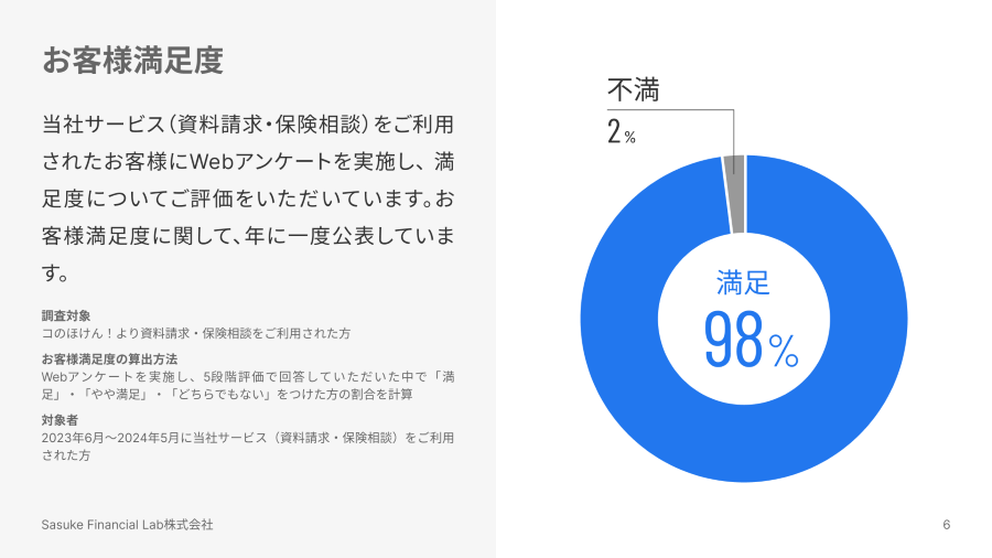 当社サービス(資料請求・保険相談)をご利用されたお客様にWebアンケートを実施し、 満足 度についてご評価をいただいています。お客様満足度は年に一度公表し、2023年度のKPIの実績に おいては、当社サービスについてお客様の98%が満足されているという結果となりました。