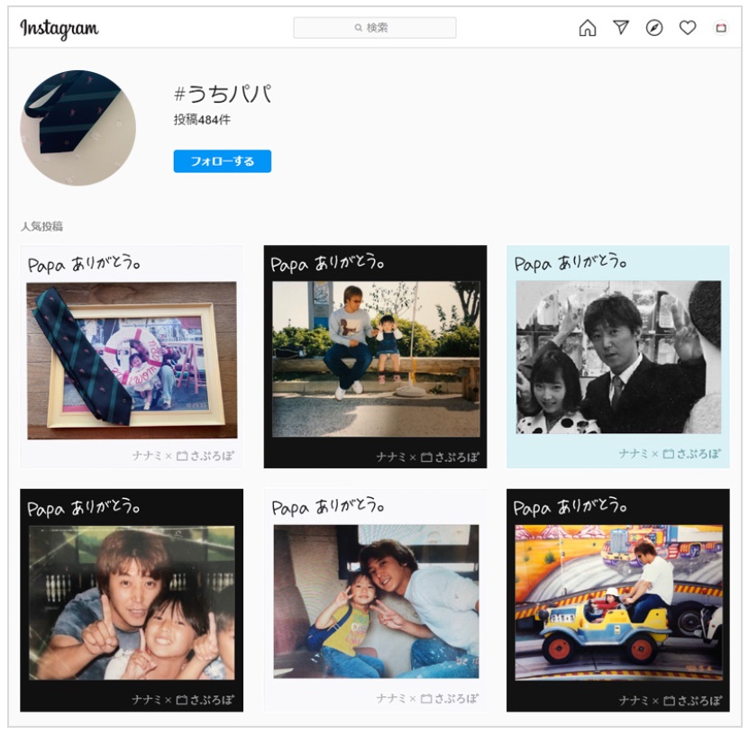 ステイセーフ、ステイホームしながらも頑張っているパパの姿と、私のお父さんという意味合いを込めた「#うちパパ」という共通言語を設定し、「ありがとう」「だいすき」「元気だして」など、お父さんへの想いを込めた写真を投稿して、instagramのフィード画面をメッセージで埋めよう!という企画。
