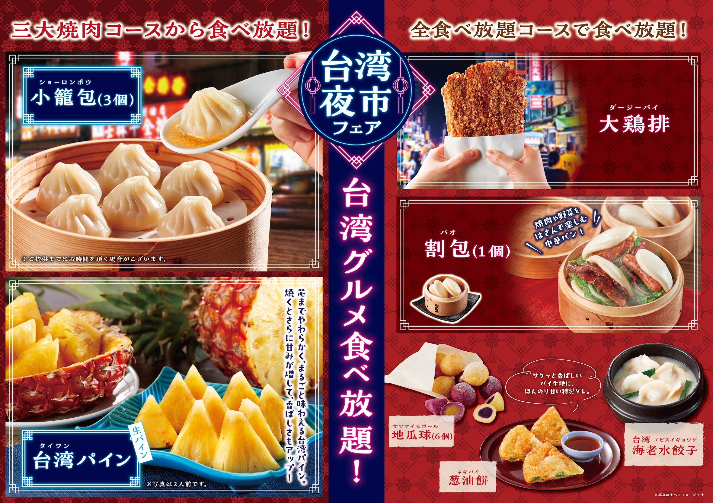 を美味しい焼肉とともに食べ放題で楽しめる特別企画です。台湾夜市の雰囲気感じ、旅行気分が