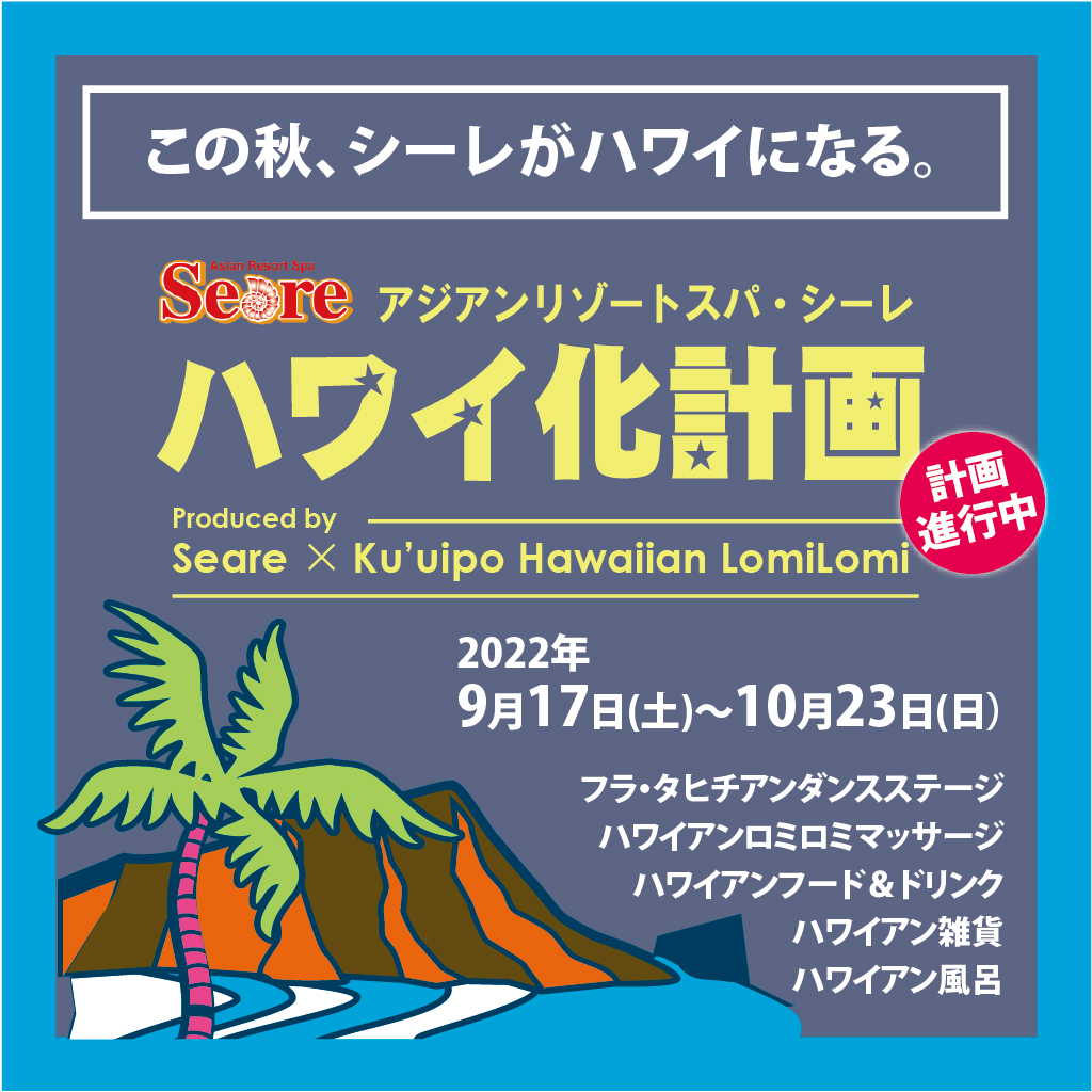 広島県安芸郡坂町の天然温泉施設アジアンリゾートスパ・シーレ(運営会社:株式会社スパライフ・コミュニケーションズ)ではクウイポロミロミスクール&サロン(運営会社:株式会社Island-Wellness)とのコラボ企画として「スパ・シーレ ハワイ化計画」を2022年9月17日(土)~10月23日(日)の期間限定で実施します。