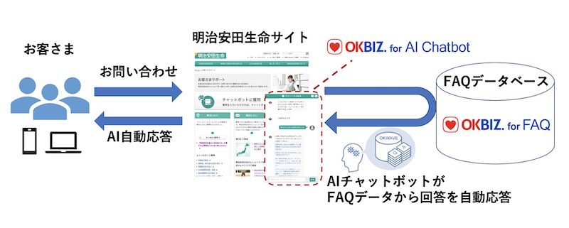 日本初、最大級のQ&Aサイト「OKWAVE」(https://okwave.jp)を運営する株式会社オウケイウェイヴ(所在地:東京都港区、代表取締役社長:福田 道夫)は、明治安田生命保険相互会社(所在地:東京都千代田区、代表執行役社長:根岸 秋男、以下「明治安田生命」)のWebサイト等を利用するお客さまの利便性の向上を目的とした対話型自動応答サービスのソリューションとして、当社AIを搭載したAIチャットボット『OKBIZ. for AI Chatbot』の提供を開始しました。