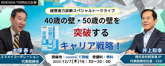 株式会社 経営者JP(東京都渋谷区、代表取締役社長・CEO 井上和幸)が運営する会員制プラットフォーム「KEIEISHA TERRACE」(https://keieishaterrace.jp)では、経営幹部やリーダーの方を対象として12月7日(木)にオンラインセミナーを開催します。