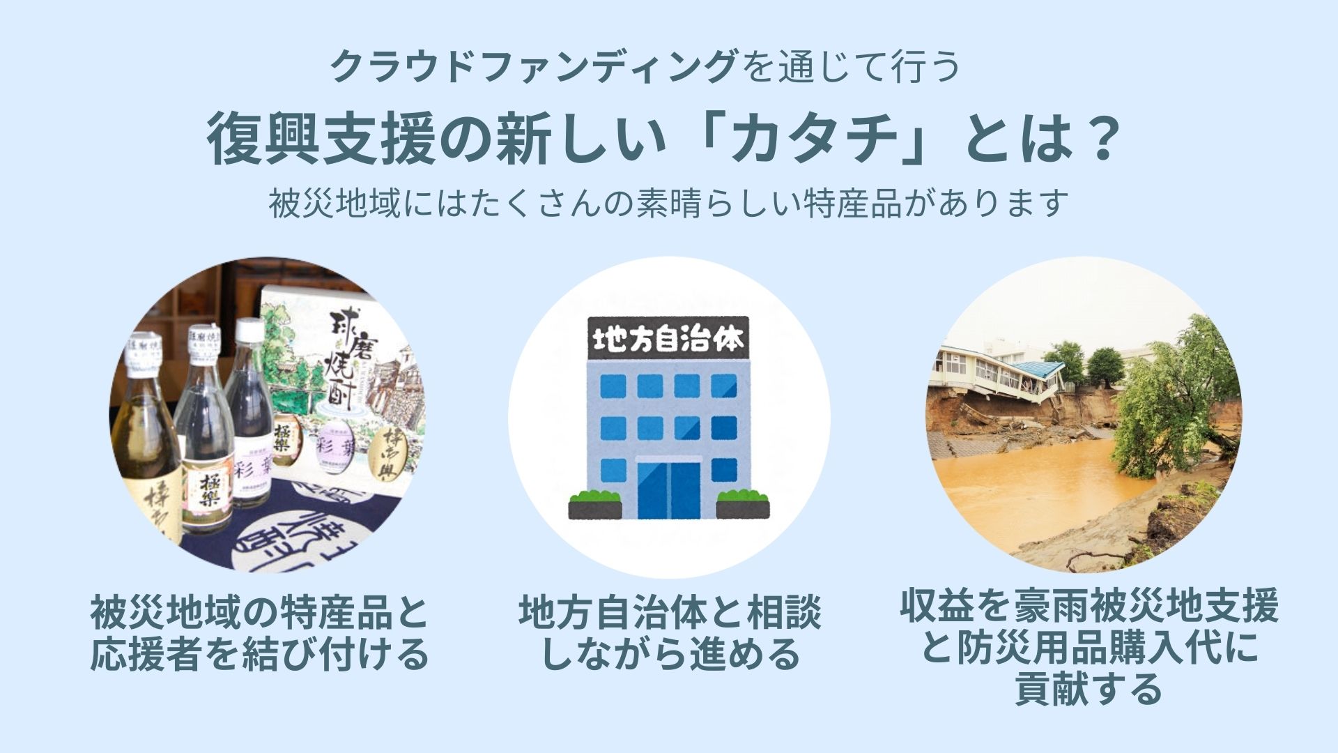 被災地域の特産品と応援者を結び付け、収益を豪雨被災地支援と防災用品購入代に貢献するクラウドファンディングを、被災経験のある大学生が取り組みます。