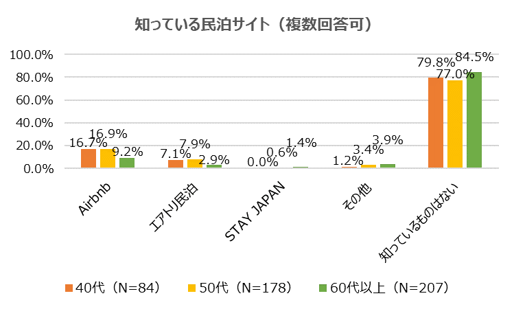 つづいて、「知っている民泊サイト」を聞きました。全ての年代で最も多かった回答は『知っているものはない』(40代:79.8%、50代:77.0%、60代以上:84.5%)となりました。昨年の民泊新法施行時に話題になった『Airbnb』(40代:16.7%、50代:16.9%、60代以上:9.2%)でさえも1割程度の認知度となり、まだまだ普及していないことがわかりました。