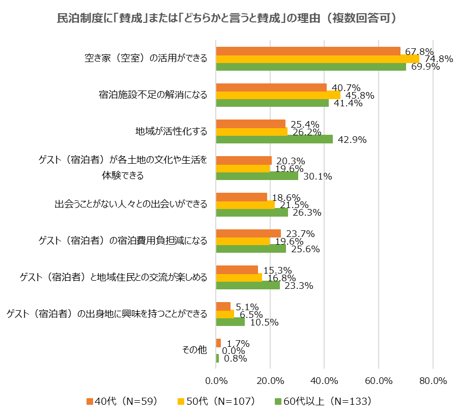 「賛成」または「どちらかと言うと賛成」と回答した人にその理由を聞きました。どの年代からも『空き家(空室)の活用ができる』(40代:67.8%、50代:74.8%、60代以上:69.9%)が最も多く、『宿泊施設不足の解消になる』(40代:40.7%、50代:45.8%、60代以上:41.4%)、『地域が活性化する』(40代:25.4%、50代:26.2%、60代以上:42.9%)とつづきました。また、60代以上は『ゲスト(宿泊者)が各土地の文化や生活を体験できる』『出会うことがない人々との出会いができる』『ゲストと地域住民との交流が楽しめる』『ゲストの出身地に興味を持つことができる』など、ゲストとの交流に関する理由が、どの年代よりも上位を占めていました。