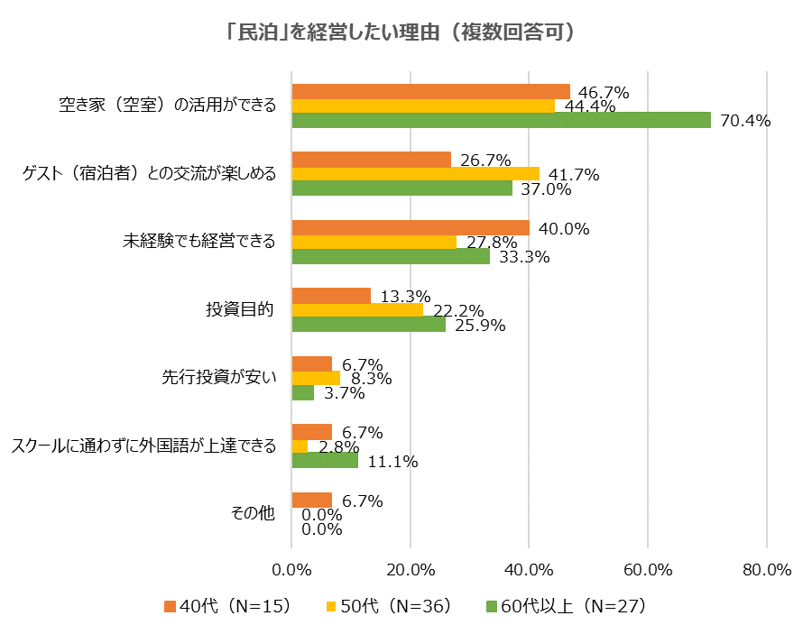 「経営したい」と回答した人にその理由を聞きました。どの年代も最も回答が多かったのは『空き家(空室)を活用できる』(40代:46.7%、50代:44.4%、60代以上:70.4%)となり、以下『ゲスト(宿泊者)との交流が楽しめる』(40代:26.7%、50代:41.7%、60代以上:37.0%)、『未経験でも経営できる』(40代:40.0%、50代:27.8%、60代以上:33.3%)とつづきました。また、40代では6.7%、50代ではわずか2.8%だった『スクールに通わず外国語が上達できる』は60代以上では11.1%いました。