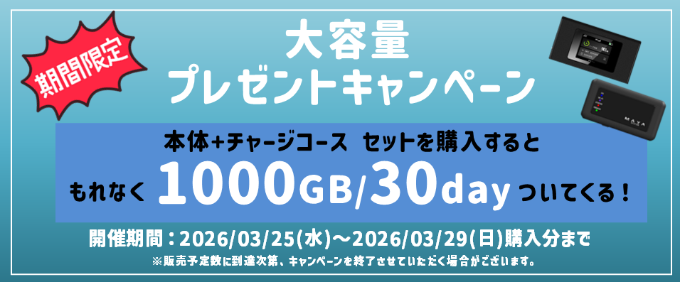 ジャパンモバイル株式会社は、2026年3月25日から2026年3月29日までの期間、Yahoo!ショッピング「J-mobileショップ」にて販売中の『プリペイドWiFi専用端末+プリペイドWiFiデータ』のセット商品を新規購入いただいたお客様を対象に、追加特典として『データチャージ1000GB/30day』がもれなくついてくる「大容量プレゼントキャンペーン」を実施いたします。