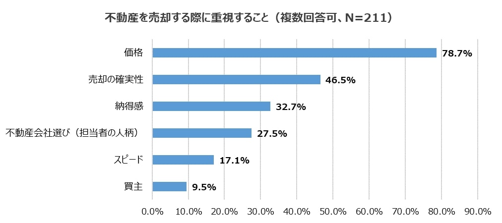 今度は、当サイトの「不動産売却」サービスを利用した人に「不動産を売却する際に重視すること」を聞いたところ、78.7%もの人が『価格』を選び、『売却の確実性』(46.5%)を大きく上回りました。また、『スピード』(17.1%)よりも『納得感』(32.7%)や『不動産会社選び(担当者の人柄)』(27.5%)を重視する人が多いことなどから、売り急いでいる売主は少なく、多少時間がかかっても、高くスマートに売却を行いたいと思っている人が多いこともわかりました。