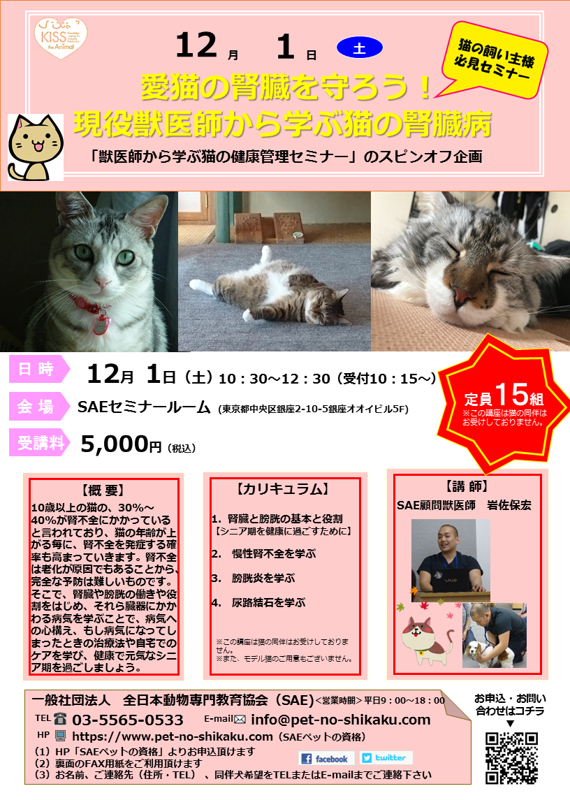 動物専門教育のエキスパート機関である一般社団法人 全日本動物専門教育協会(所在地:東京都中央区、理事長:大橋教正、以下「SAE」)は、現役獣医師から学べるセミナー「獣医師から学ぶ猫の健康管理」のスピンオフ企画となる「愛猫の腎臓を守ろう!現役獣医師から学ぶ猫の腎臓病」セミナーを、2018年12月1日(土)にSAEセミナールームにて開催します。
