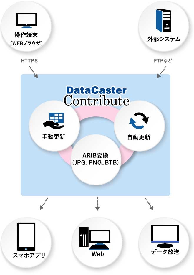 当システムは、データ放送システムでは国内で圧倒的な導入実績があるメディアキャストの「DataCaster Contribute (データキャスター コントリビュート)」をベースに、TBSの運用仕様に合わせて機能拡充したもので、TBS社内外から各種情報(気象、災害、ニュース、番組情報、プロ野球情報など)を自動収集し、データ放送規格であるARIB規格をはじめとする各種フォーマットへ自動変換し、全国のJNN系列各局へデータ放送用の情報を配信します。