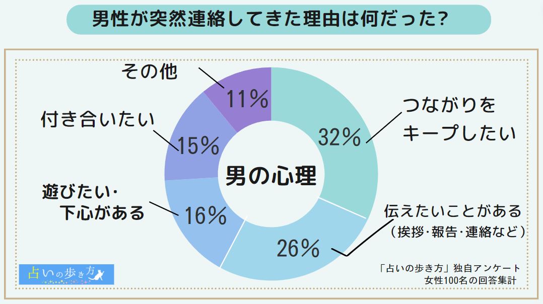占いの歩き方編集部で実施した「忘れた頃に連絡してくる男性の心理について」の調査結果によると、1位「繋がりをキープしたい」が32%、2位「伝えたいことがある(挨拶・報告・連絡など)」が26%、3位「遊びたい・下心がある」が16%、4位「付き合いたい(告白)」が15%、5位「その他」が11%という結果になりました。