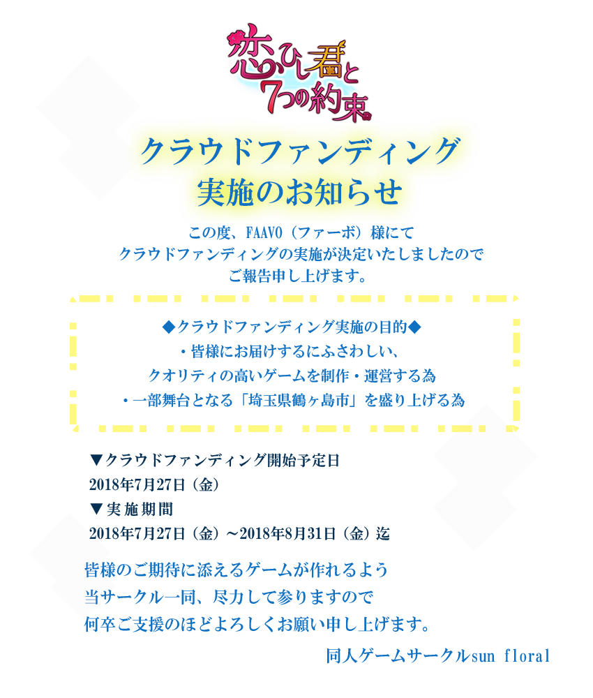 女性向け恋愛ノベルゲーム『恋ひし君と7つの約束』※読みは「こいしきみとななつのやくそく」(配信・運営「同人ゲームサークルsun floral」)は、7月22日(日)より公式ページを新たに公開し、クラウドファンディング実施告知を出しましたことをお知らせ致します。