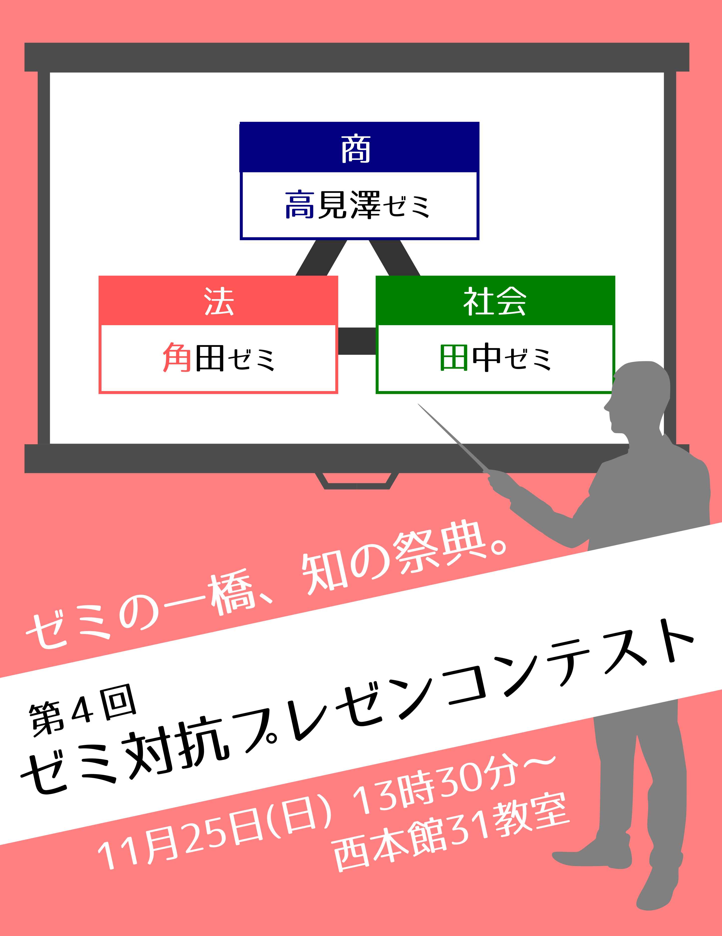 今年で4回目を迎えるゼミ対抗プレゼンコンテストでは、書類選考の結果3つのゼミが参加資格を得ました。商学部からは高見澤ゼミ(統計学・ファイナンス)、法学部からは角田ゼミ(民法)、社会学部からは田中ゼミ(政治学・比較政治経済学・政治理論)が出場します。各ゼミが自ら設定したテーマに基づき、20分間のプレゼンを行います。