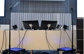 登壇者が入れ替わる際に高さを合わせたり、演説終了後にポールを一番低くしてミラー部分を隠すなどの用途で使用されます。株主総会では質疑応答の際にミラーを下げ、株主様の顔がよく見えるような工夫をすることもできます。