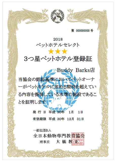 動物専門教育のエキスパート機関である一般社団法人 全日本動物専門教育協会(所在地:東京都中央区、理事長:大橋教正、以下「SAE」)は、ライセンス教育で培った専門知識を統合し『ペットホテルを対象に、犬猫の飼い主が安心利用できるサービスのレベルを星の数で認証する』わが国のペット業界では初めての格付け認証制度を9月1日よりスタートします。運営事務局にはSAE100%出資会社の株式会社SAEマーケティングワンがあたります。