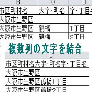 例えば、列A:「大阪市」 列B:「中央区高津」 列C:「1-9-10」 のような場合 列Dが追加され 内容は、「大阪市中央区高津1-9-10」となります。
