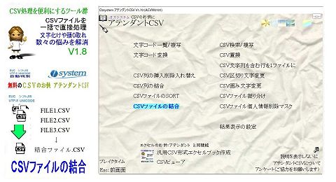 CSV処理をより便利にする無料ツール集「CSVのお供 アテンダントCSV」をバージョンアップ。CSVファイルの結合を行います。