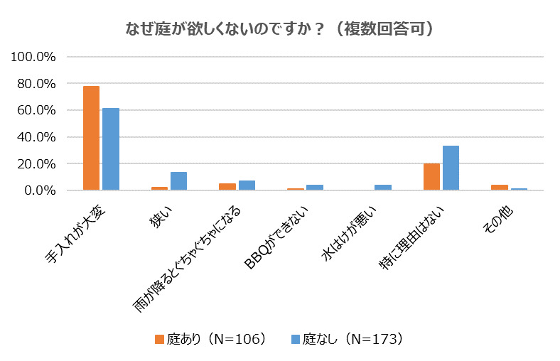「庭がない」人の『庭は欲しくない』は共に約7割!