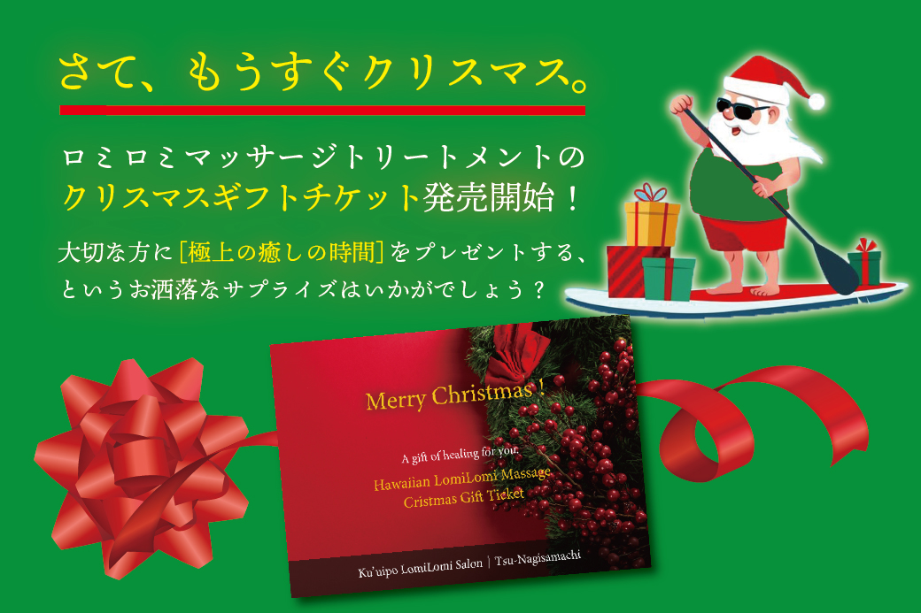 ハワイアンマッサージ・ロミロミのサロンとスクールを運営するクウイポロミロミ(経営:株式会Island-Wellness)は、クリスマスに向けてハワイアンロミロミマッサージの【クリスマスギフトチケット】を販売開始しました。ギフトを贈られた方のココロとカラダを徹底的に癒すための極上のクリスマススペシャルメニューを用意。いつもの「モノ」のプレゼントと違った、「イキイキとした明日のための癒しの時間」を贈るという粋なプレゼントです。