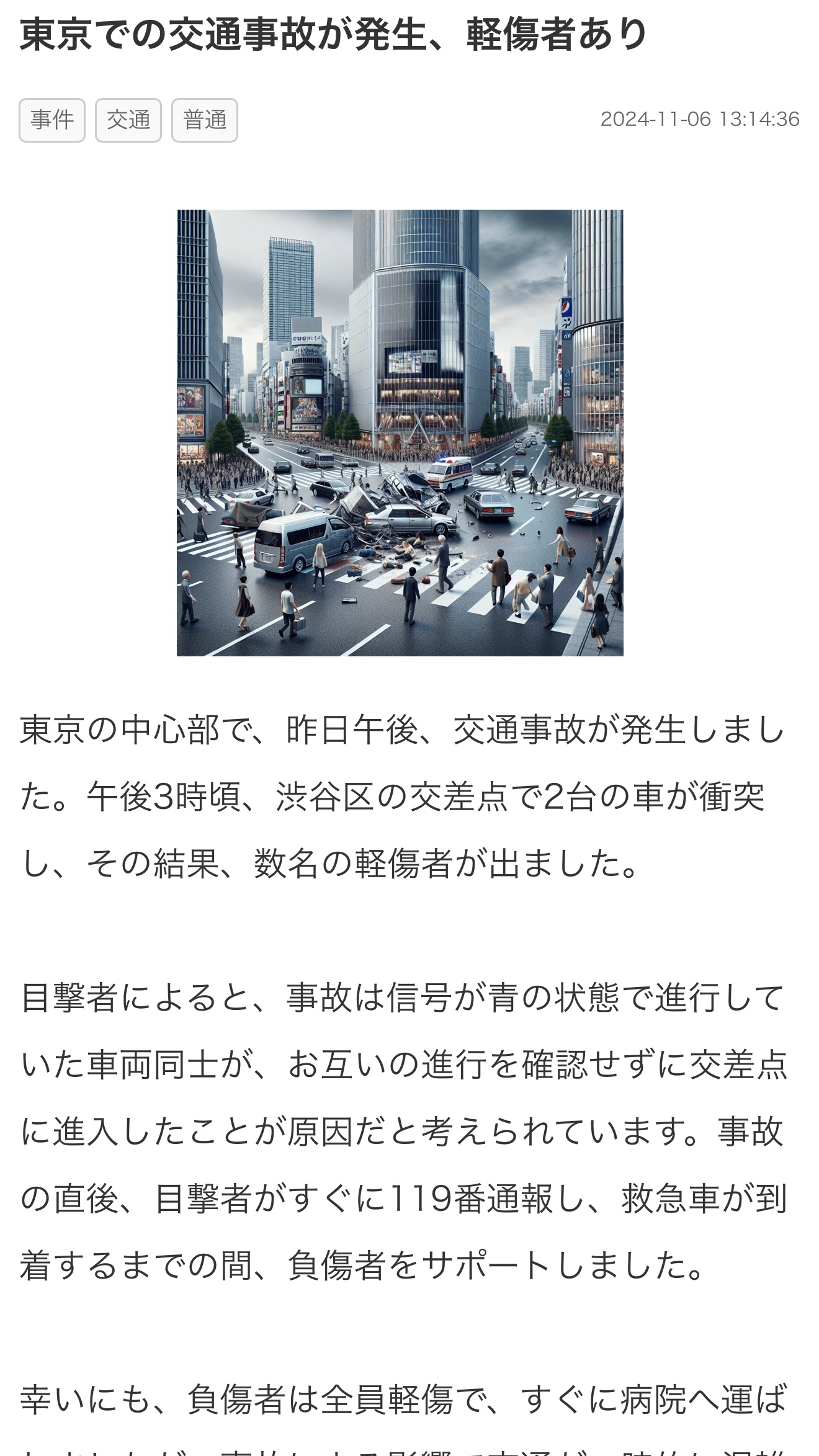 東京での交通事故が発生、軽傷者あり