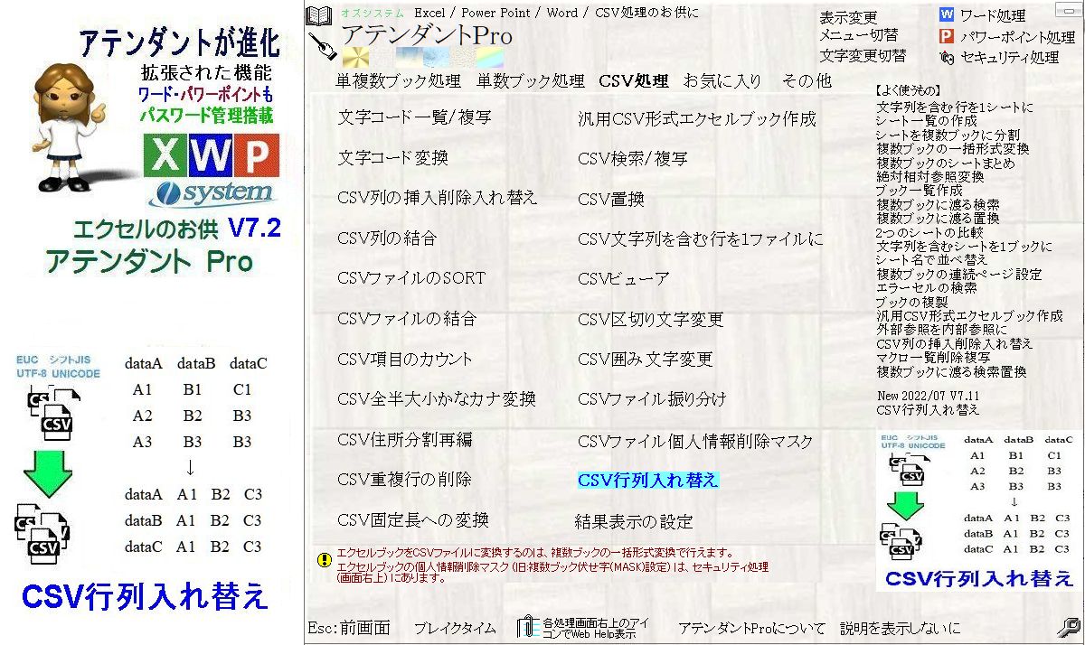 アテンダントProをV7.2バージョンアップ。CSV行列入れ替えを追加・ファイルを指定するだけで簡単にCSVファイルそのままで行列入れ替えができます。