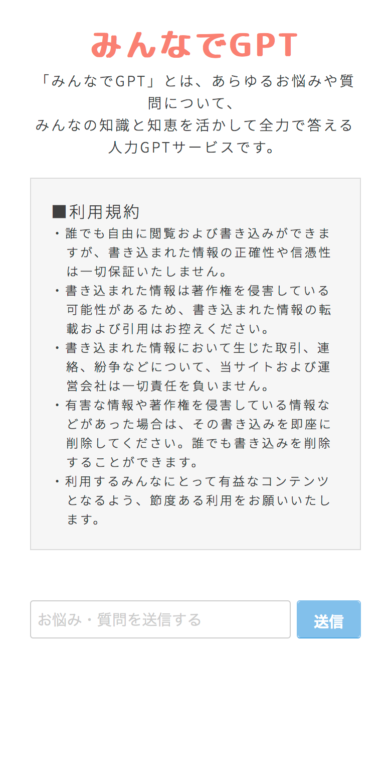 ChatGPTなどのAI生成技術の進展に伴い、AIには欠けている人間の知識と知恵、経験を活かした、より魅力的なサービスとして「みんなでGPT」を立ち上げました。