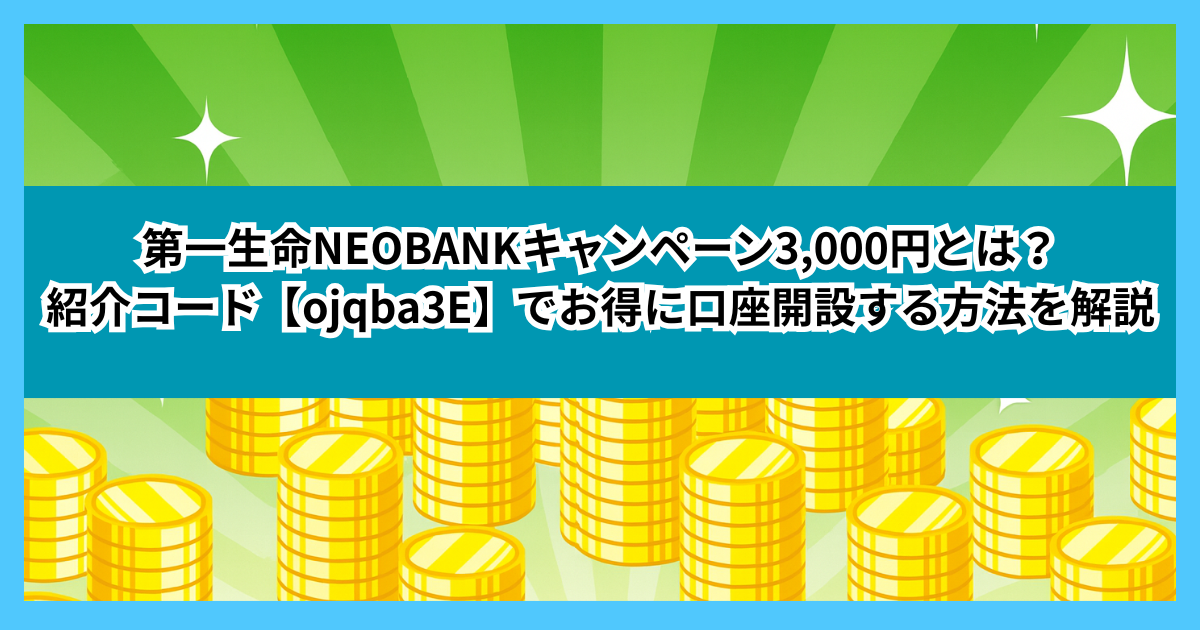 第一生命NEOBANKキャンペーン3,000円の内容をわかりやすく解説。紹介コード【ojqba3E】の使い方、口座開設の流れ、特典の仕組み、注意点まで初心者向けにやさしくまとめました。お得に第一生命NEOBANKを始めたい方は必見です。