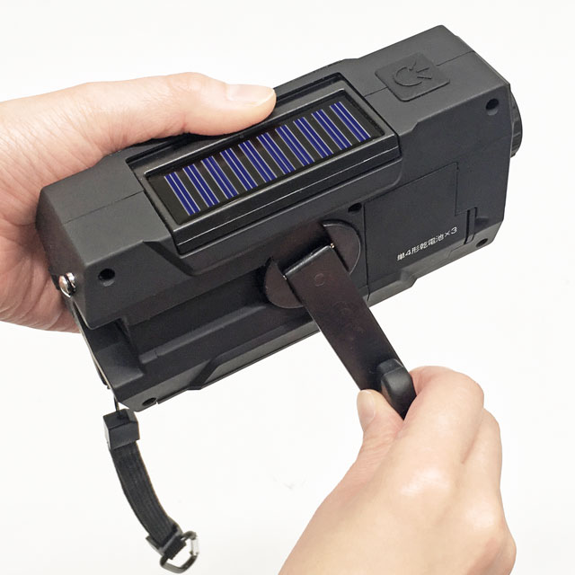 ハンドルを回す「手回し充電」、本体に搭載したソーラーパネルで太陽光を電力に変換する 「ソーラー充電」。さらに付属のUSBケーブルをつなげればパソコンや家庭用コンセントから も充電できます。