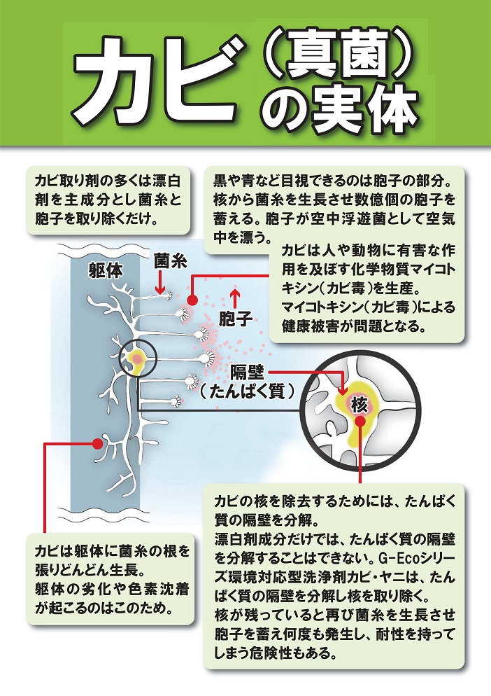 新製品G-Ecoシリーズ環境対応型水性防カビ・防菌剤 ストレートタイプ、防カビ・防菌剤を塗布した周りにカビの発育阻止帯を形成し、長期間の防カビ・防菌効果を実現します。