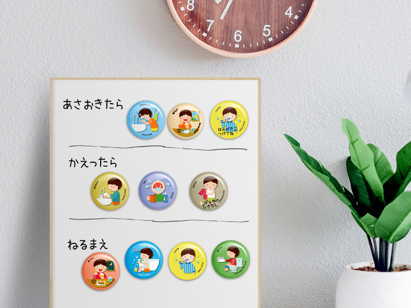 種類:12種類(朝ごはん、昼ごはん、晩ごはん、おふろ、ハミガキ、うがい、かおをあらう、きがえる、おひるね、おトイレ、手をあらう、かたづける)