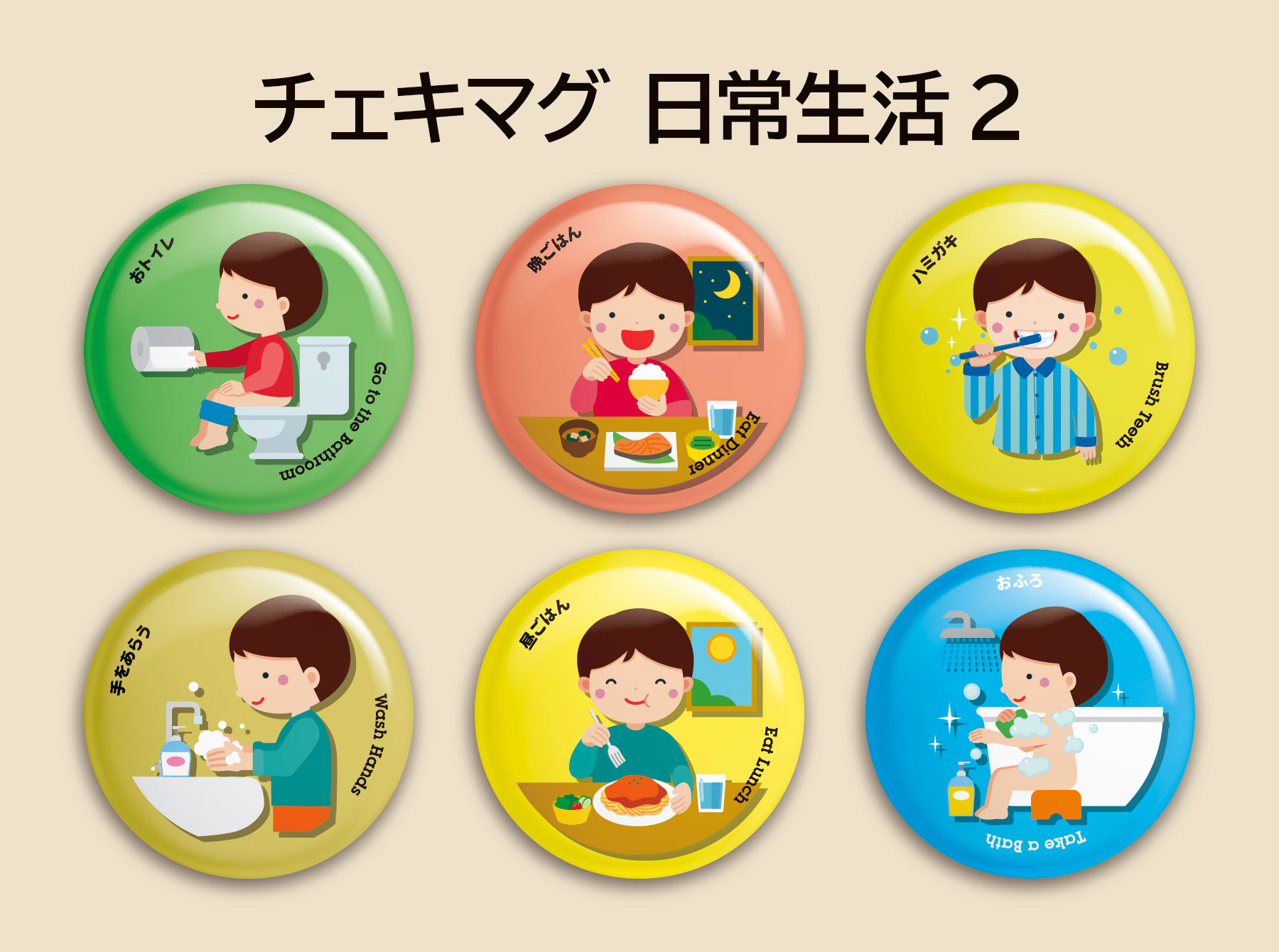 この度、発達障がいをお持ちのお子様のお母様から、日常生活のトレーニング用として、食事や着替え、歯磨きなど、日々の行動をイメージしたチェキマグを作ってほしいというご要望をいただきました。