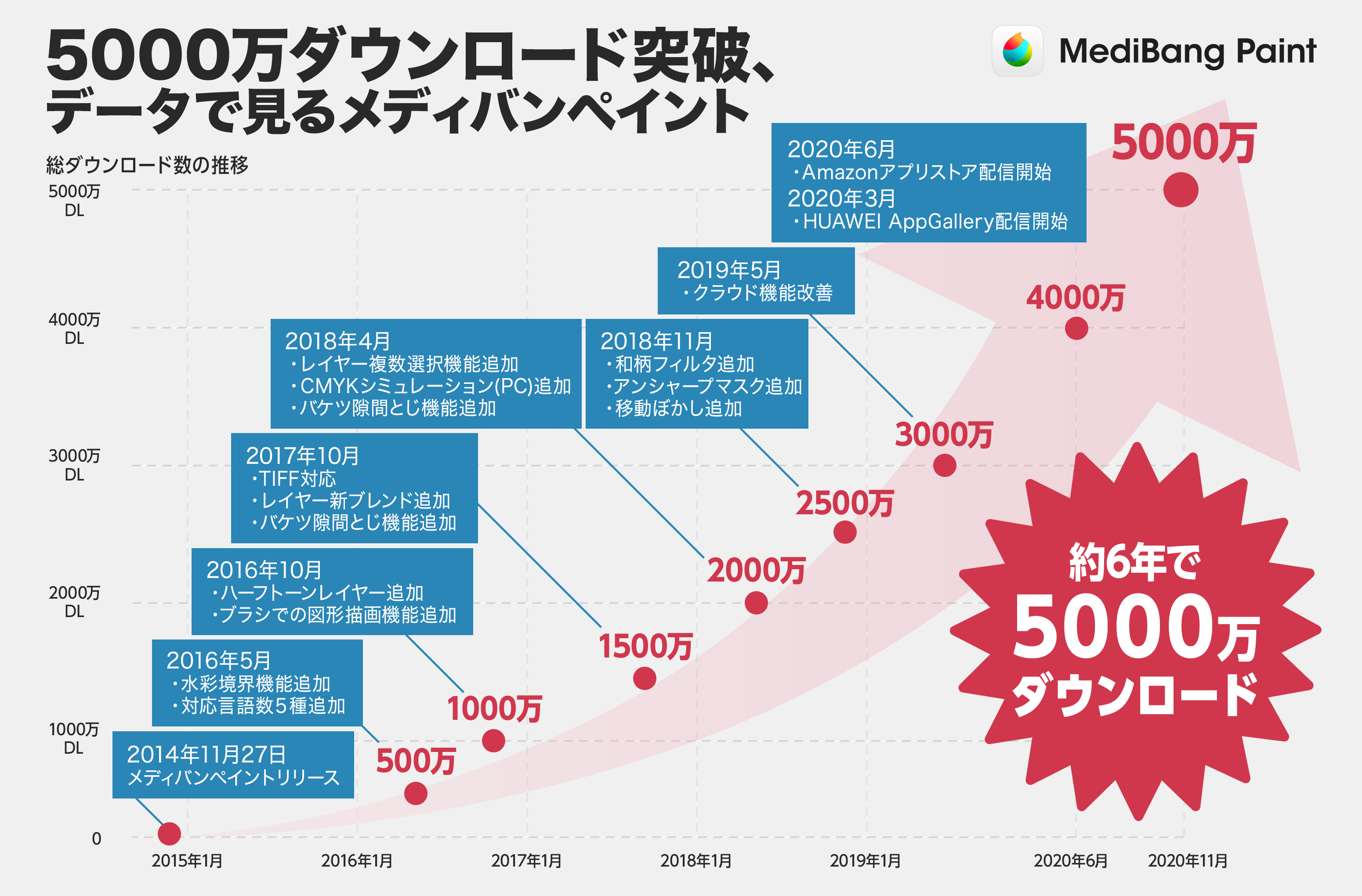 2014年11月のリリースより、ユーザーに支持されペイントソフトとしては非常に早いスピードで全世界に拡大・拡散し、約6年で5,000万ダウンロードを突破しております。