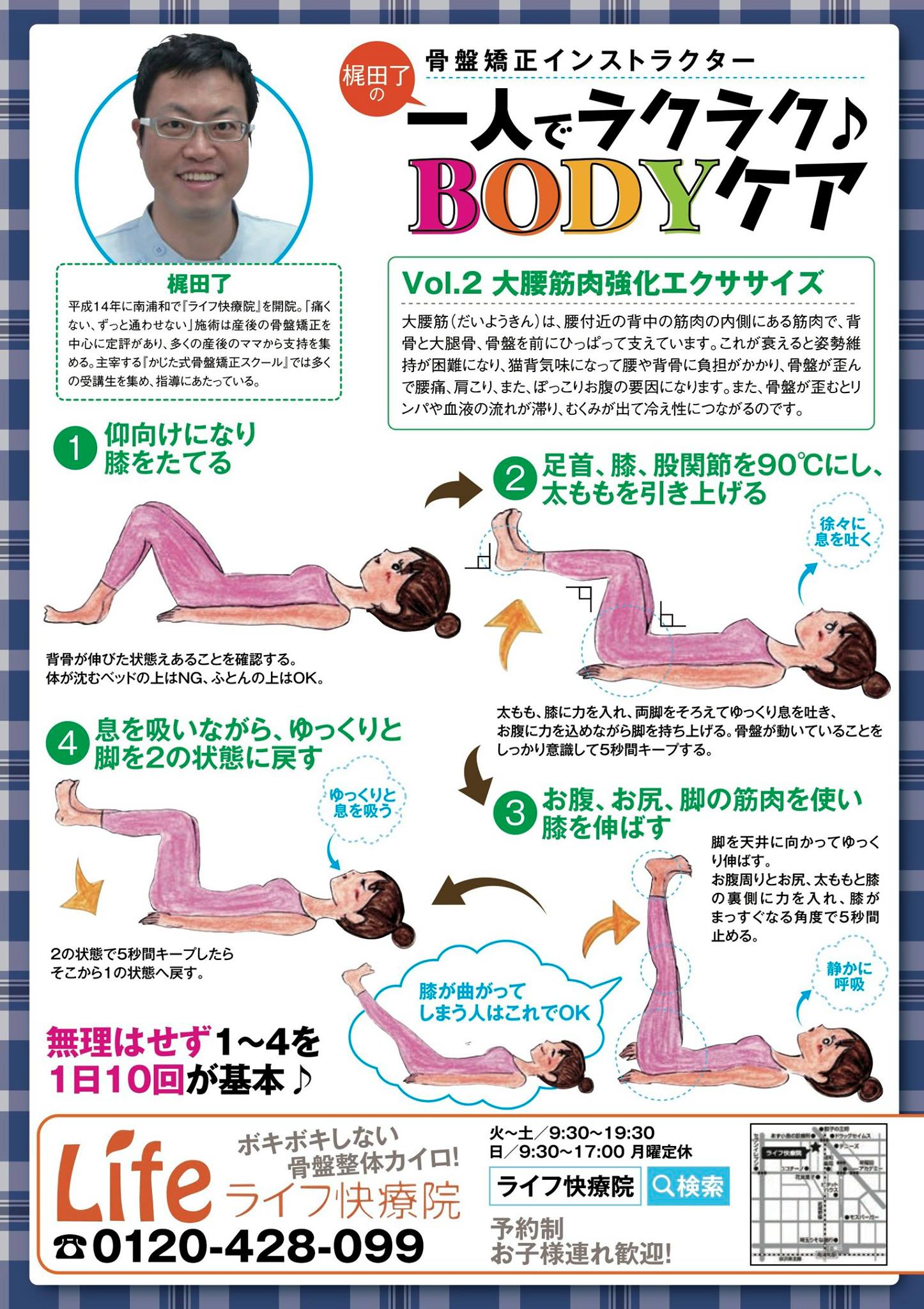 これらのエクササイズは、産後の快適な体への回復に役立ちますが、個人の体調や状況によって適切なエクササイズが異なる場合があります。始める前には、医療専門家のアドバイスを受けることをお勧めします。