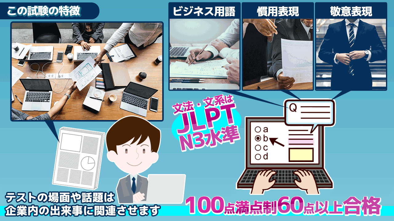 語彙、文法、読解、聴解の内容は全部カバーしております。受験者の総合的な日本語能力をテストいたします。