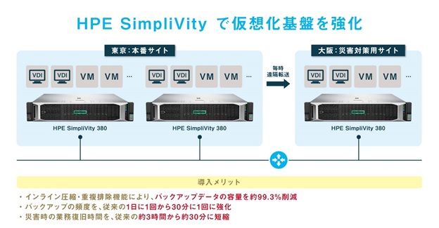 SimpliVityの導入により、VDIの安定性・信頼性の改善に成功し、インライン圧縮・重複排除機能により、バックアップデータの容量が約99.3%削減されました。BCP対策として、以前は日次バックアップで前日のデータに戻すことしかできませんでしたが、導入後は30分ごとにバックアップを取得して1時間に1回災害対策サイトへ遠隔転送しています。また、SimpliVityのフェールオーバー自動化ツールにより、災害時の業務復旧時間も従来の約3時間から約30分へと劇的に短縮しています。