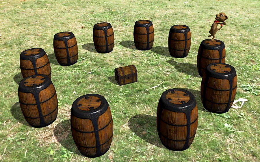 次々と樽から飛び出すキャラクターをキャッチする、もぐらたたきのようなミニゲーム!飛び出してくる位置を目で追うだけでなく、Magic Leapの立体音響によって耳でも位置を察知して楽しむことができます。