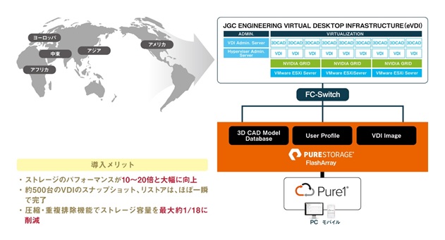 日揮グローバルは、各エンジニアが使用する設計環境をエンジニアリングVDI(以下eVDI)で提供していますが、プラントが大規模化している昨今、従来のHDDベースのストレージ環境では、VDIイメージの展開に時間がかかり、また、レスポンスや計算処理速度に問題が生じていました。今回の「Pure Storage FlashArray//X50」によるストレージ環境の刷新により、性能は約10~20倍アップし、より快適に設計が行えるようになりました。